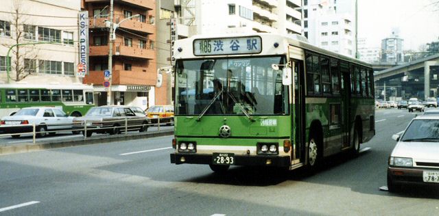 [橋85]つながりで1枚。不評をかって少ししか続かなかった赤黄塗装のH代(M-H118)である。なお、赤羽橋止まりは折り返しの都合上、一ノ橋から赤羽橋にかけて一本北の道路(環状3号/外苑東通り)を走り、赤羽橋交差点を2回右折して元のルートに戻っていた(上の路線図参照)。これは現在でも変わっていない。ちなみに、同ルートはバス以外右折禁止となっているので注意。