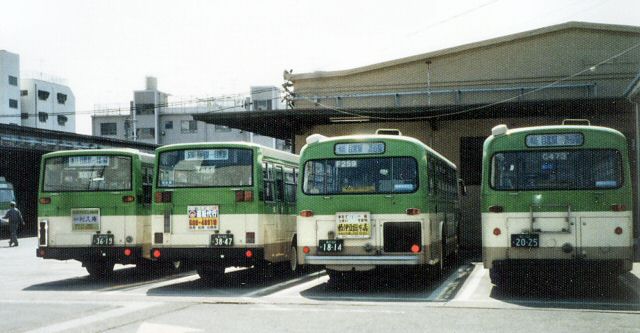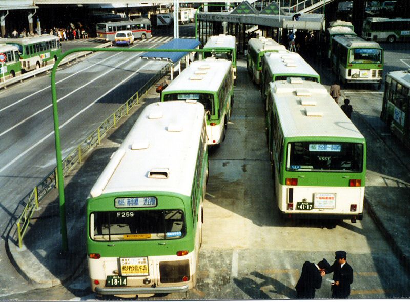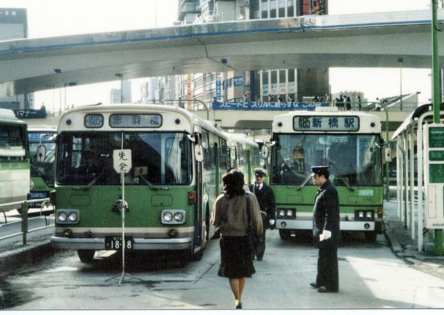 渋谷駅の歩道橋から見渡した一枚。今も昔も活気のあるターミナルである。[都01]の屋根つきターミナルが懐かしい。[橋85]は都市新バス化する前は古参から最新鋭までバラエティー豊かな車が入っていた。最後尾左のF259は昭和53年度、右のV551は平成元年度と、11年の開きがある。[橋85]の都市新バス化に伴って大量導入された専用車はV代(後期)であったが、目黒営業所は前期にも7輌導入(V550〜V556)していたため、およそ半年だけ新鋭のV代が[橋85]で走る姿を見ることができた。