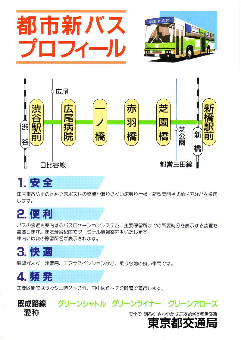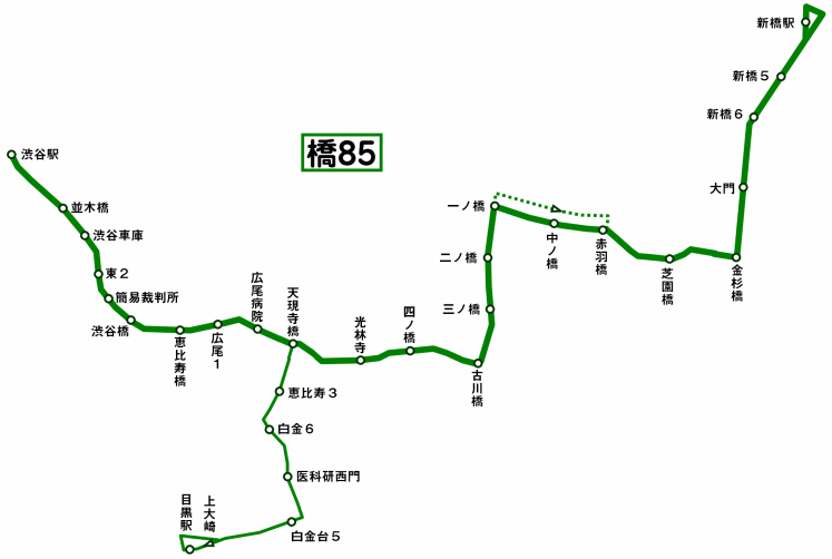 渋谷駅と新橋駅を結ぶ[橋85]。同じところを結ぶ系統として、昭和58年に都市新バス化された[都01]渋谷駅〜六本木〜新橋駅が存在するが、両者の雰囲気は全く異なる。ビジネス街や歓楽街を走り抜ける[都01]に比べ、病院から住宅地、オフィスビルまでより幅広く、地元に密着した感じがする。かつての都電35系統の代替として目黒営業所担当で誕生した[橋85]は乗客も多く、本数も多かった。狭い道路もなく、都市新バス化の効果が高いと判断されたのか、都市新バス化では[都01]に7年の遅れをとりながらも平成2年3月31日より都市新バス第6弾「グリーンエコー」として新たなスタートを切ることになった。